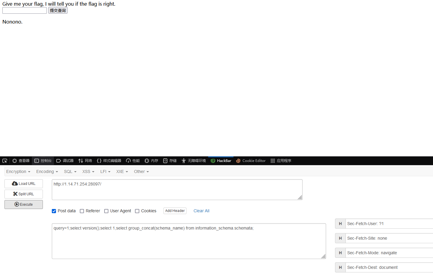 import requests url = "http://7e692c90-6f0b-4aa3-babf-89bb436f6b4f.node4.buuoj.cn:81/" with open('sql-fuzz.txt') as f: for line in f: data = {"query": line} r = requests.post(url,data=data) if('Nonono' in r.text): print(line.strip(),end=" ")
